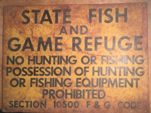 Title (ebay affiliate link): CALIFORNIA Fish and Game Refuge No Hunting or Fishing metal non-porcelain sign