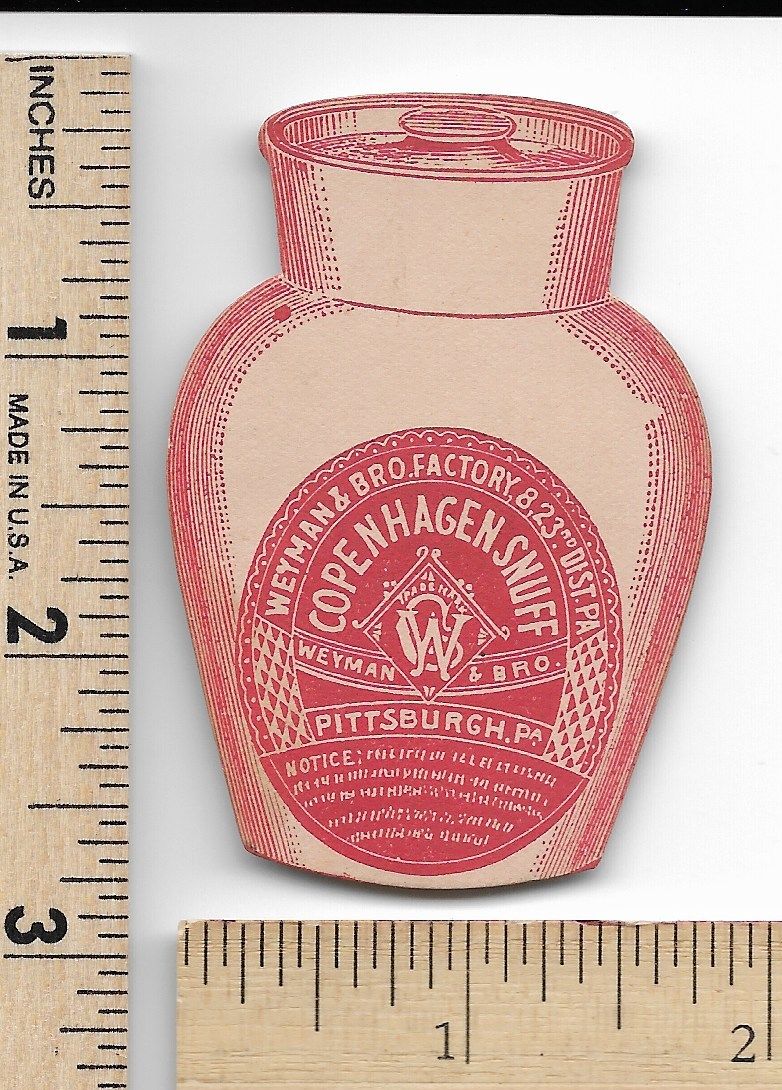 Title (ebay affiliate link): COPENHAGEN SNUFF die-cut ?spittoon? Tobacco Weyman & Bro Factory Trade Card