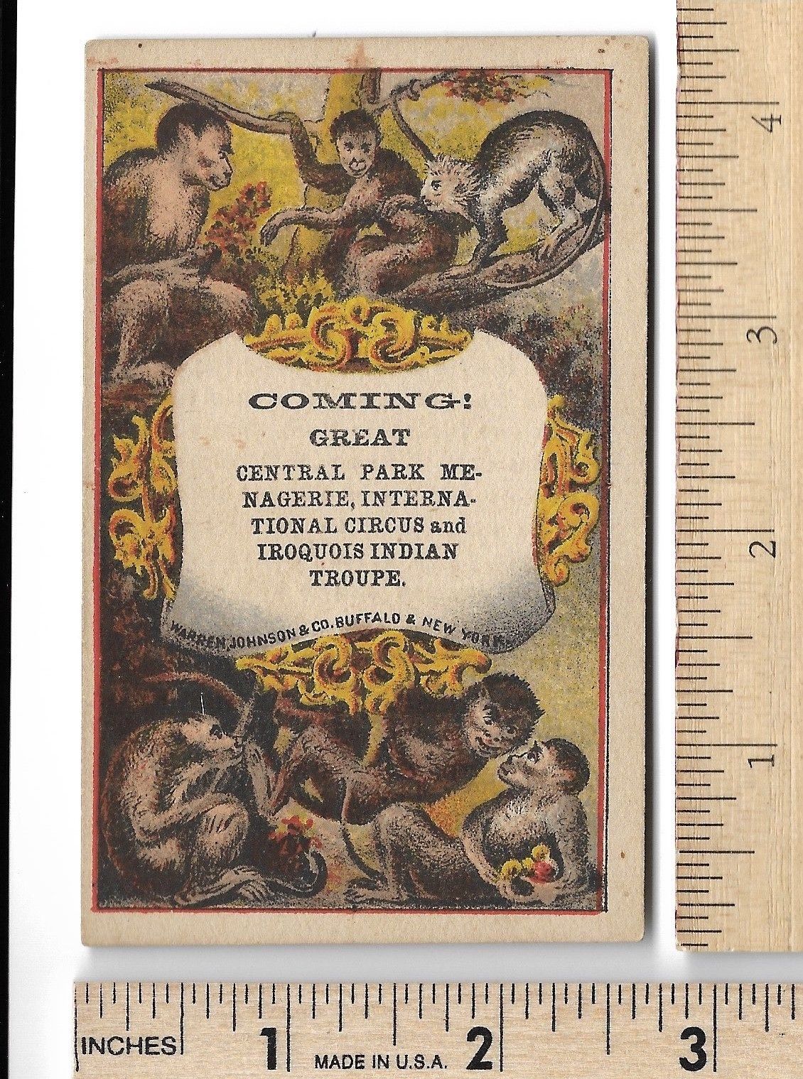 Title (ebay affiliate link): Circus CENTRAL PARK MENAGERIE IROQUOIS INDIAN TROUPE C.1870-72 Monkey Trade Card