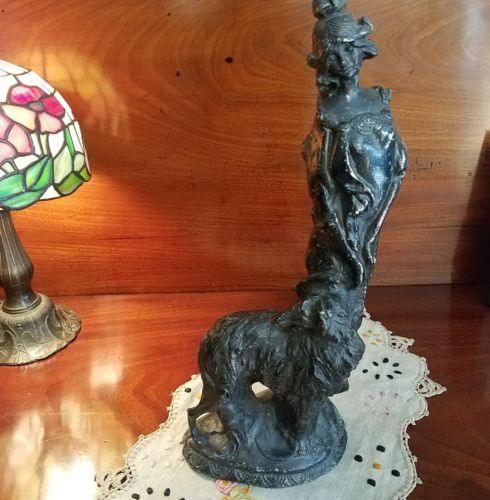 Art Deco Spelter Statue Lady & Dog Era 1920''s Figural Decor