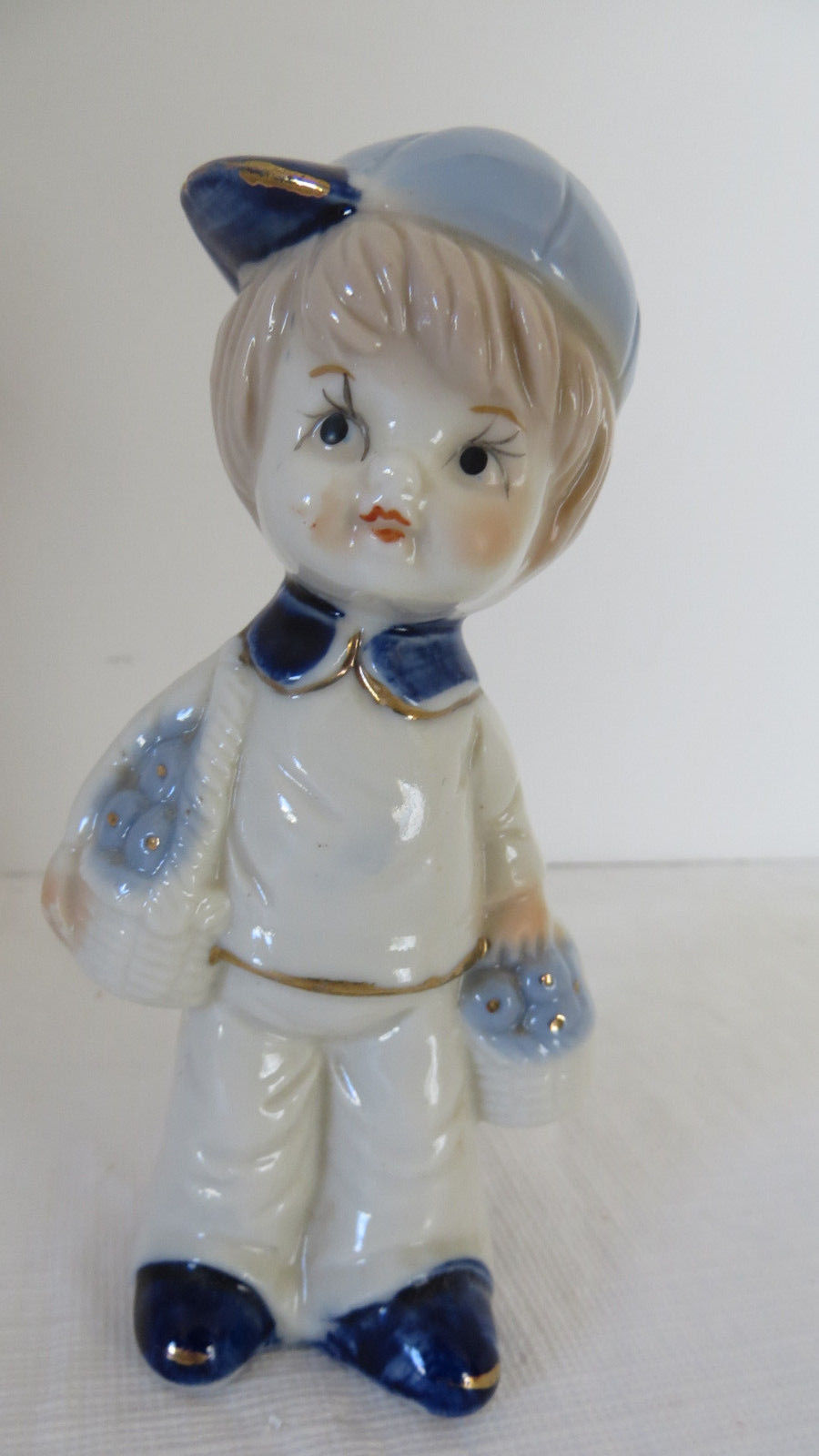 Vintage Ceramic Blue & White Boy with Baskets Figurine