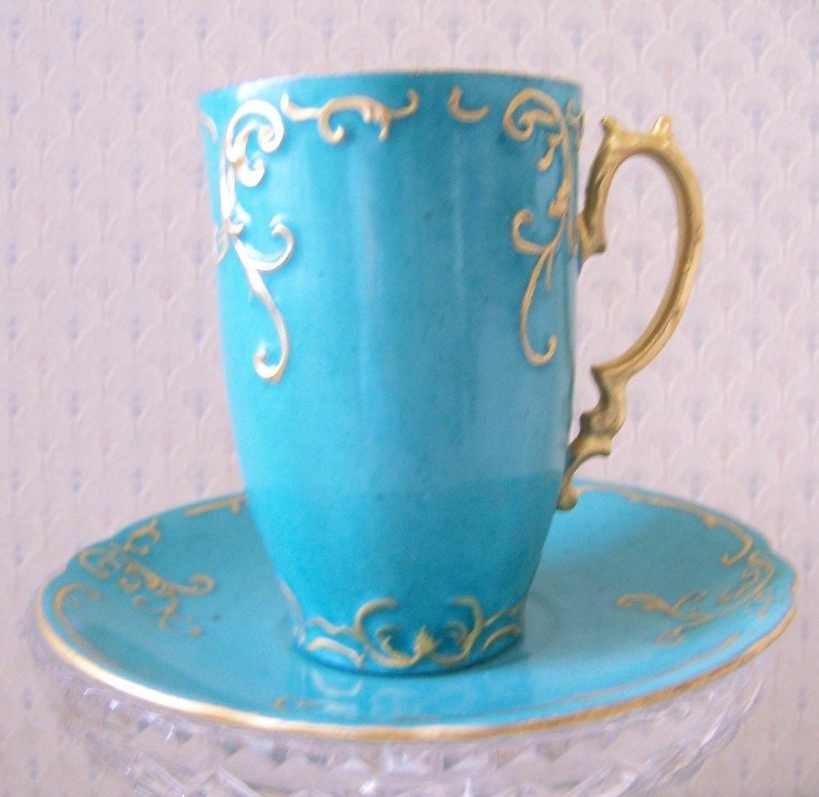 Vintage Demitasse Tea Cup And Saucer blue green with gold trim