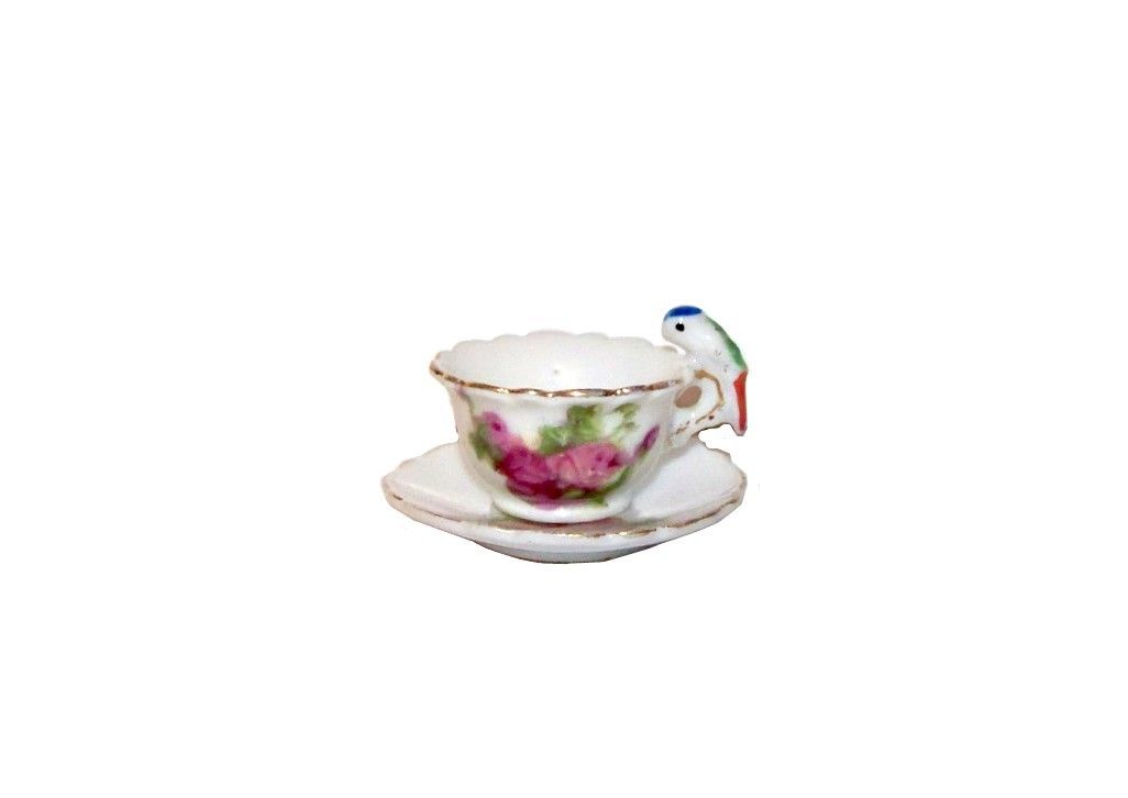 Vtg Miniature Hand Painted Japan Parrot Bird Handle Cup & Saucer Roses Gold Trim