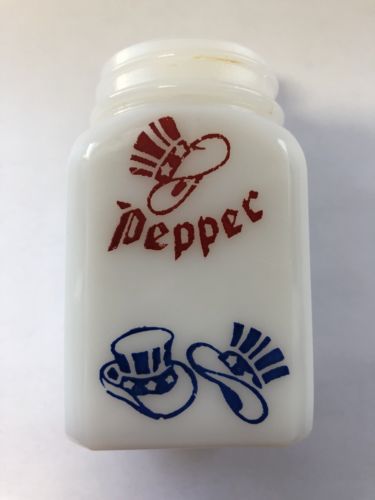 Title (ebay affiliate link): Antique Milk Glass Pepper Shaker Red White Blue Uncle Sam Hats Patriotic