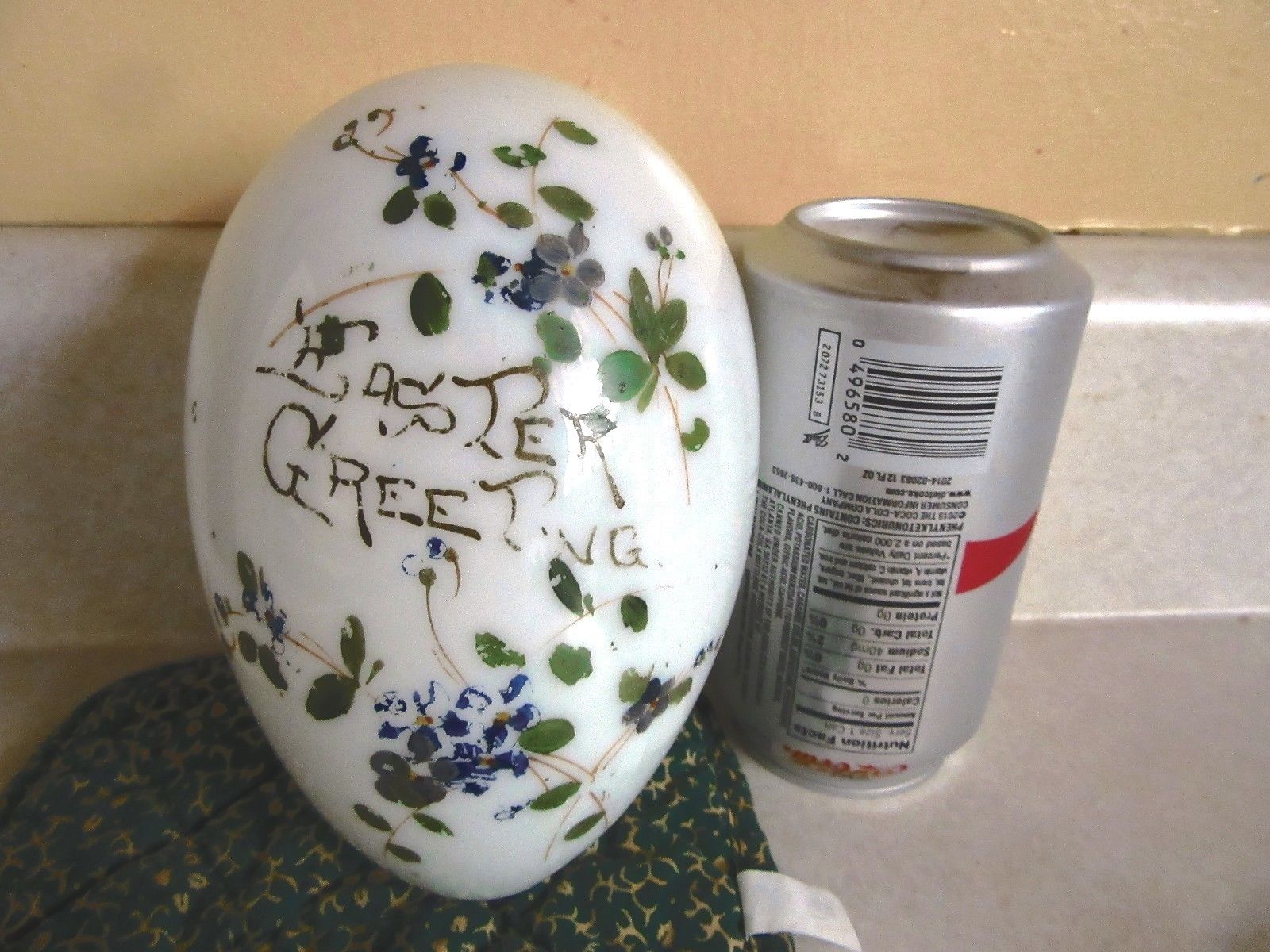 Title (ebay affiliate link): antique large blown milk glass easter greetings egg- and painted, 13" X 16"