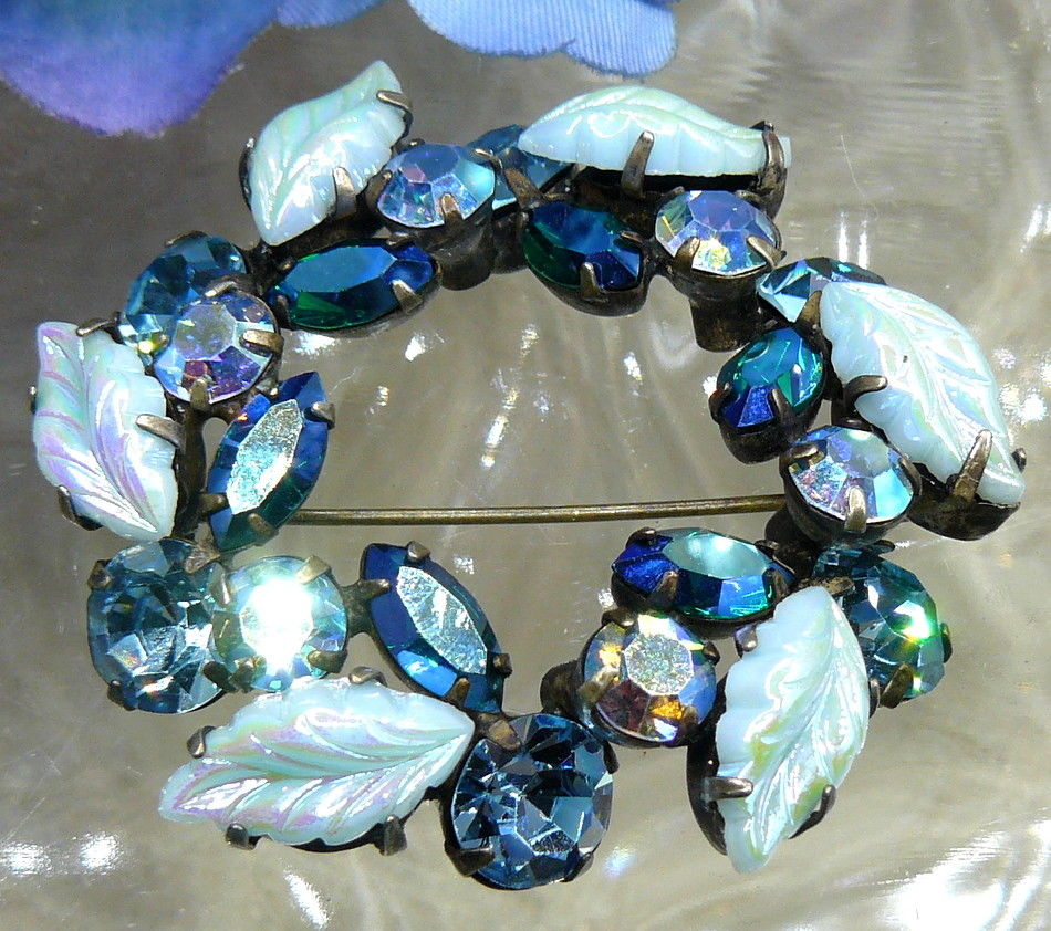 Title (ebay affiliate link): REGENCY VINTAGE SIGNED BEAUTIFUL BLUE MOLDED AB MILK GLASS RHINESTONE PIN BROOCH