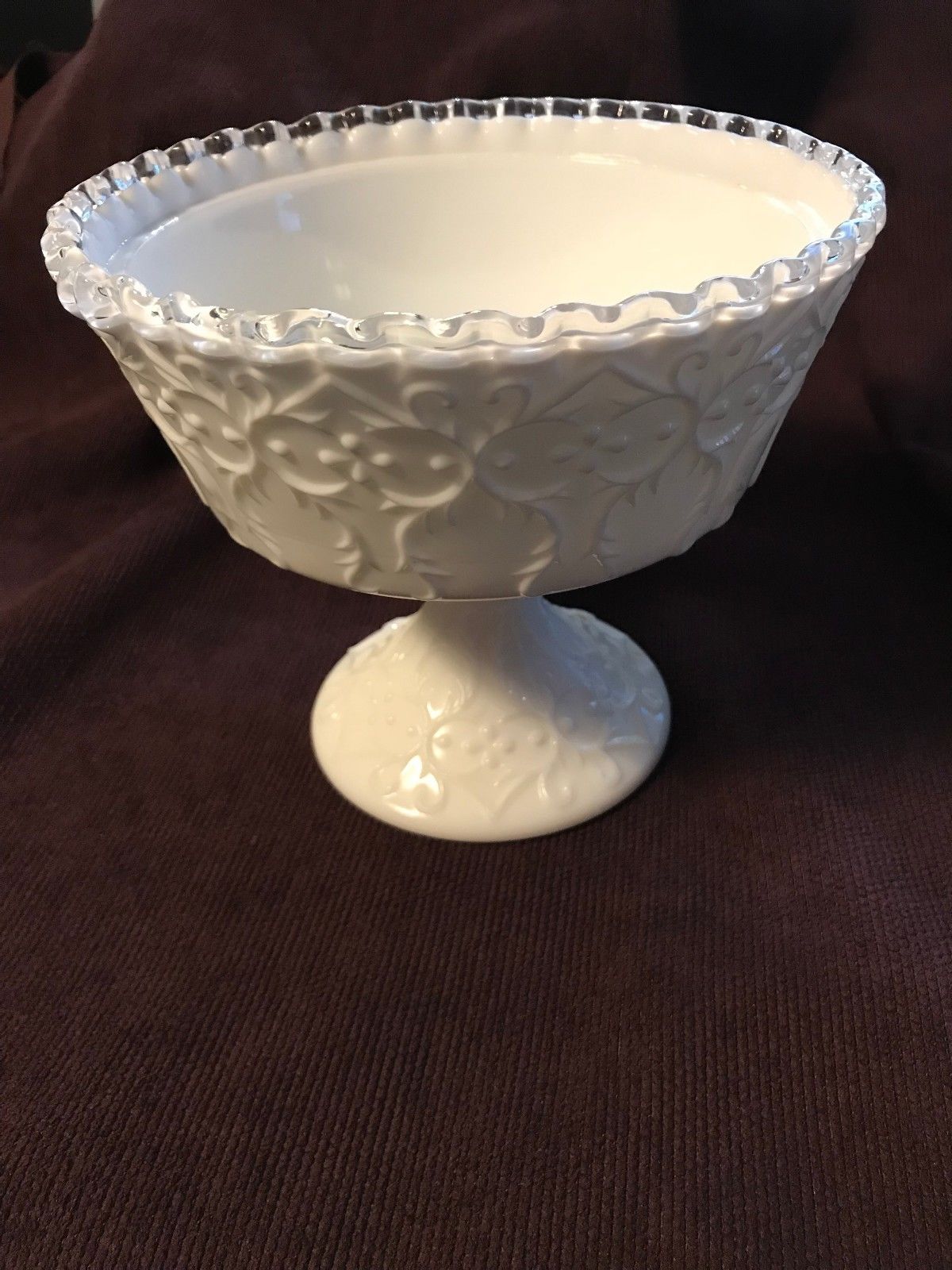 Title (ebay affiliate link): Fenton Milk Glass Silver Crested Pedestal Compote SPANISH LACE Crimped