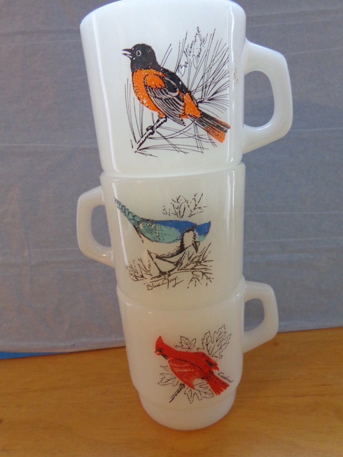 3 Fire King Anchor Hocking Birds Milk Glass Mug DIFFERENT BIRDS 2 SIDES STACKABL