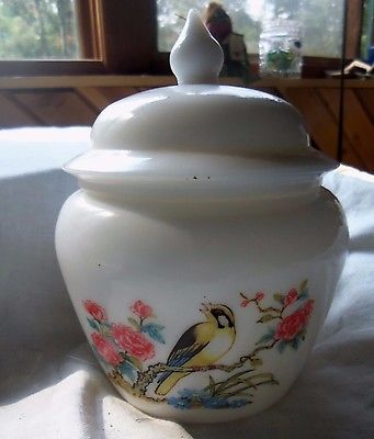 Title (ebay affiliate link): AVON MILK GLASS GINGER JAR BIRD ON A BRANCH BEAUTIFUL FLOWERS