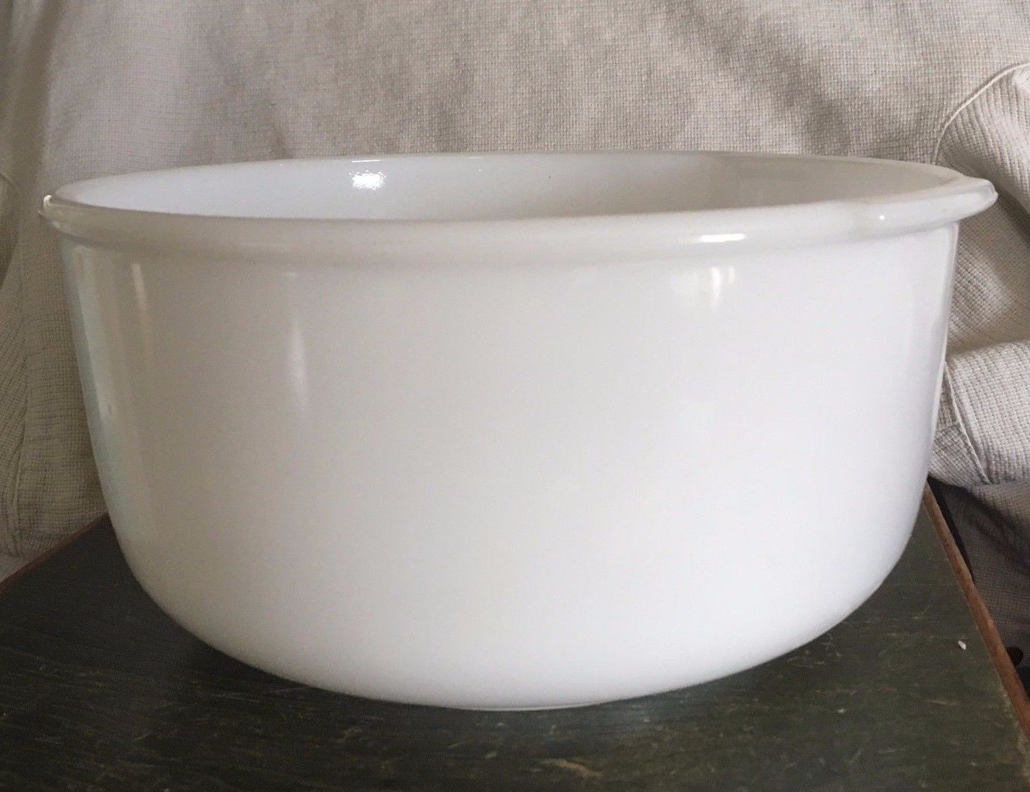 Title (ebay affiliate link): VNTG Glasbake Sunbeam milk glass mixing bowl, 9 Cup, 2 handles