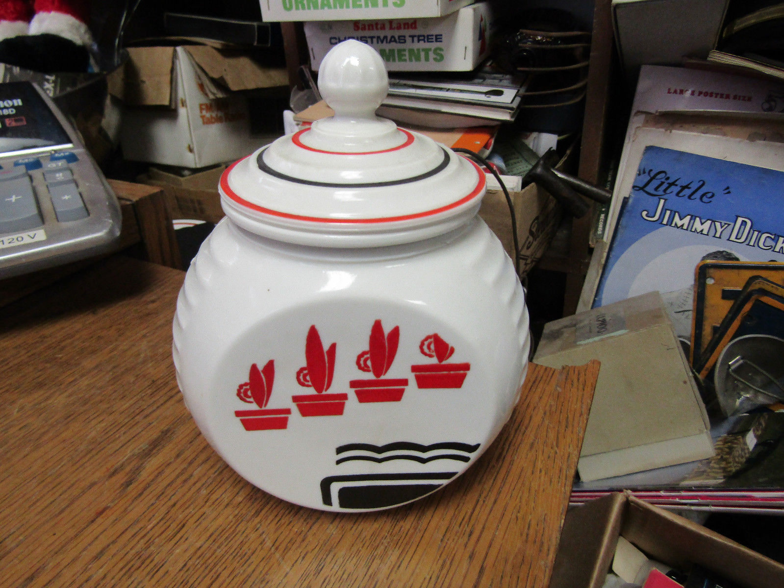 Title (ebay affiliate link): Vintage VITROCK Anchor Hocking Red Flower Pot Grease JAR Canister Milk Glass LID