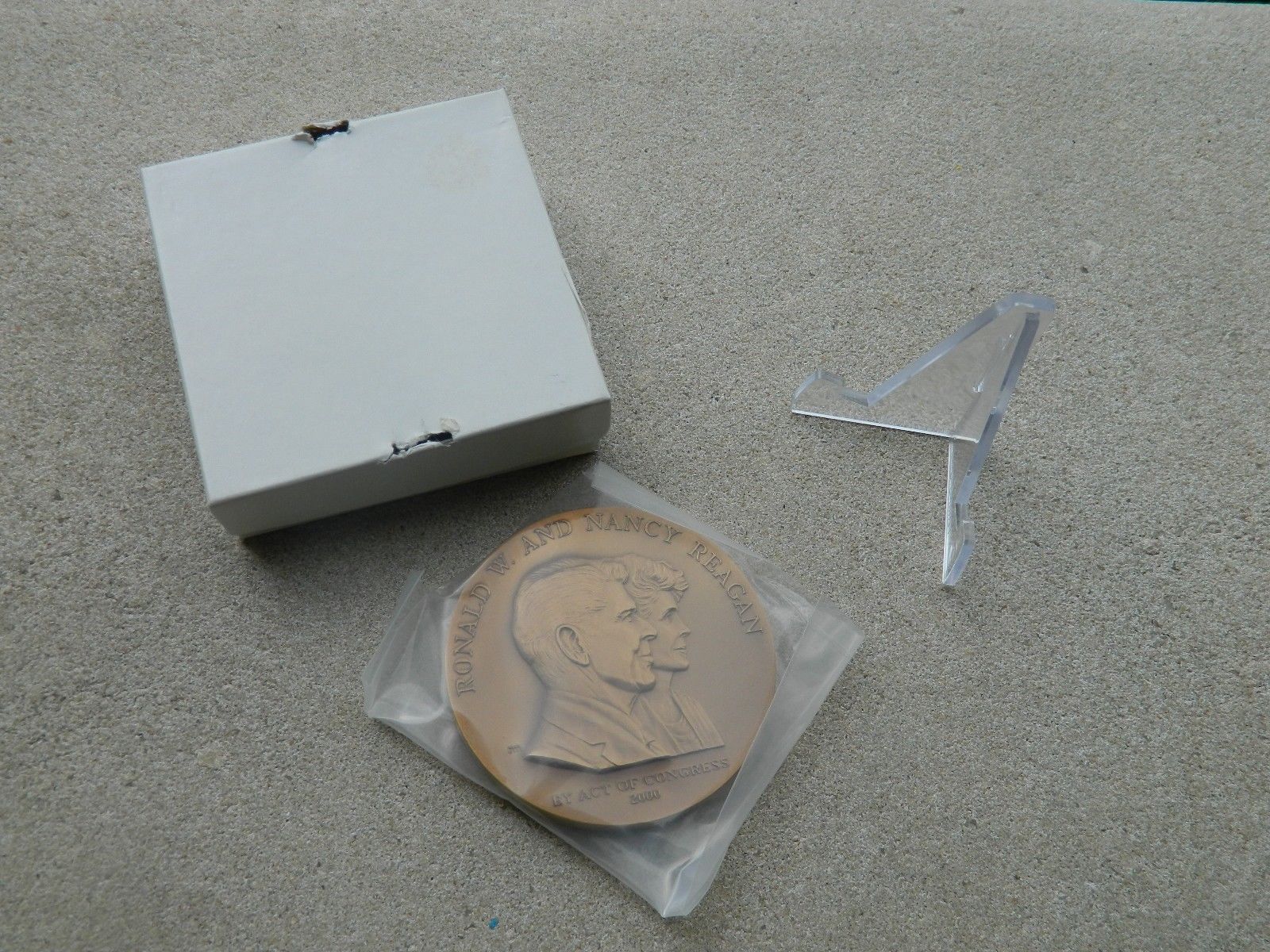Title (ebay affiliate link): US MINT RONALD AND NANCY REAGAN 3" BRONZE MEDAL WITH BOX AND STAND
