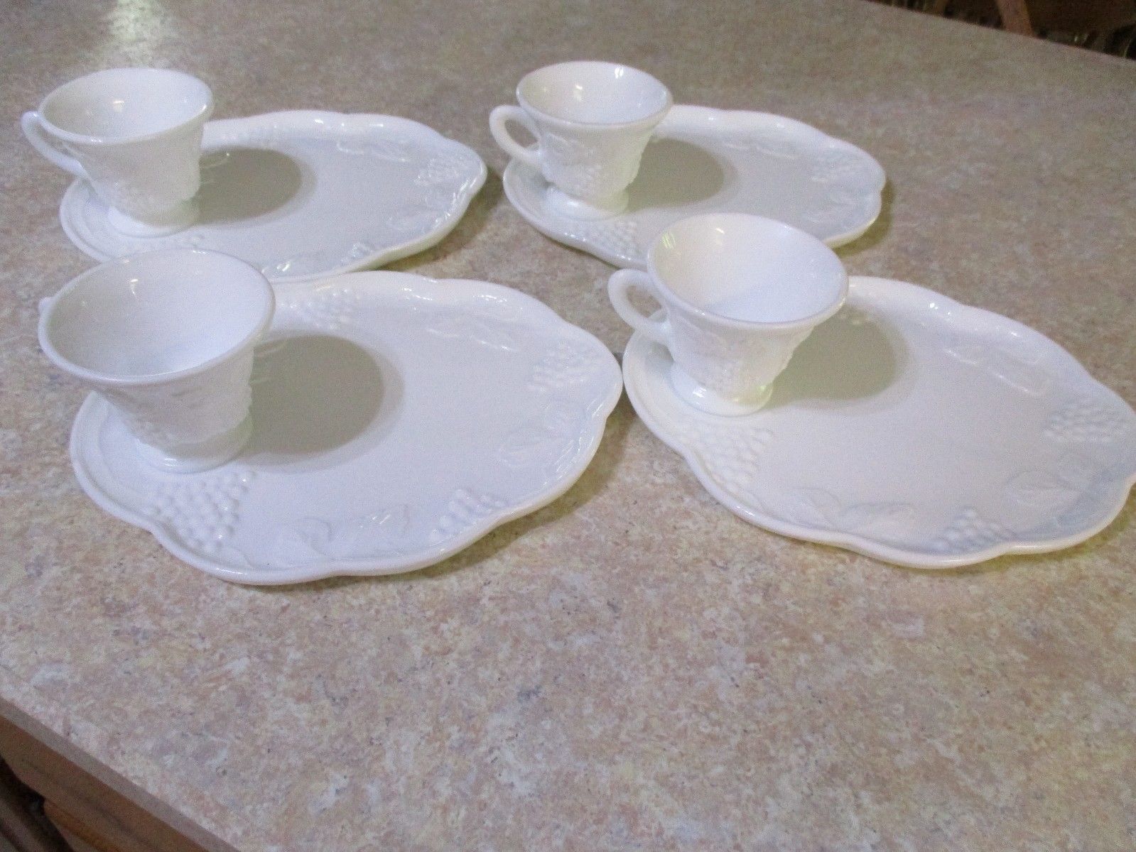 Title (ebay affiliate link): Set 4 Snack Plates & Tea Cups Vintage 1960 Milk Glass Grape Leaf White Luncheon