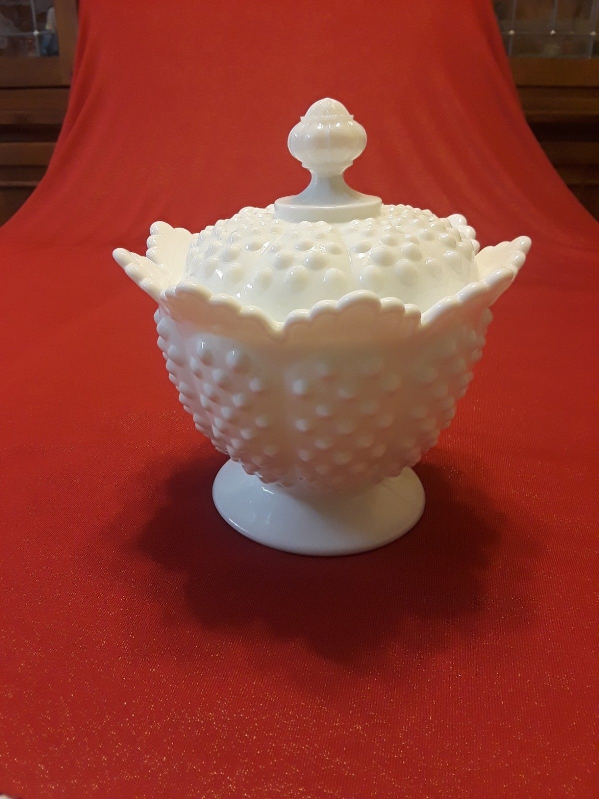 Title (ebay affiliate link): Fenton Milk Glass Hobnail Lidded Candy Dish Saw w/Tooth Edge