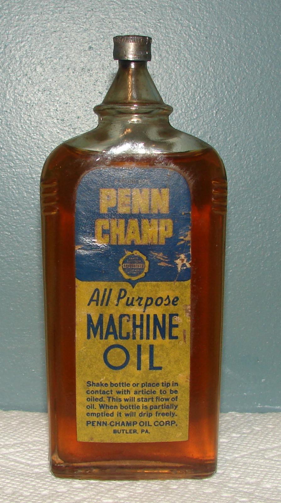 Title (ebay affiliate link): Vintage PENN CHAMP 4oz GLASS BOTTLE ALL PURPOSE MACHINE OIL RARE!! FILLED NICE!!