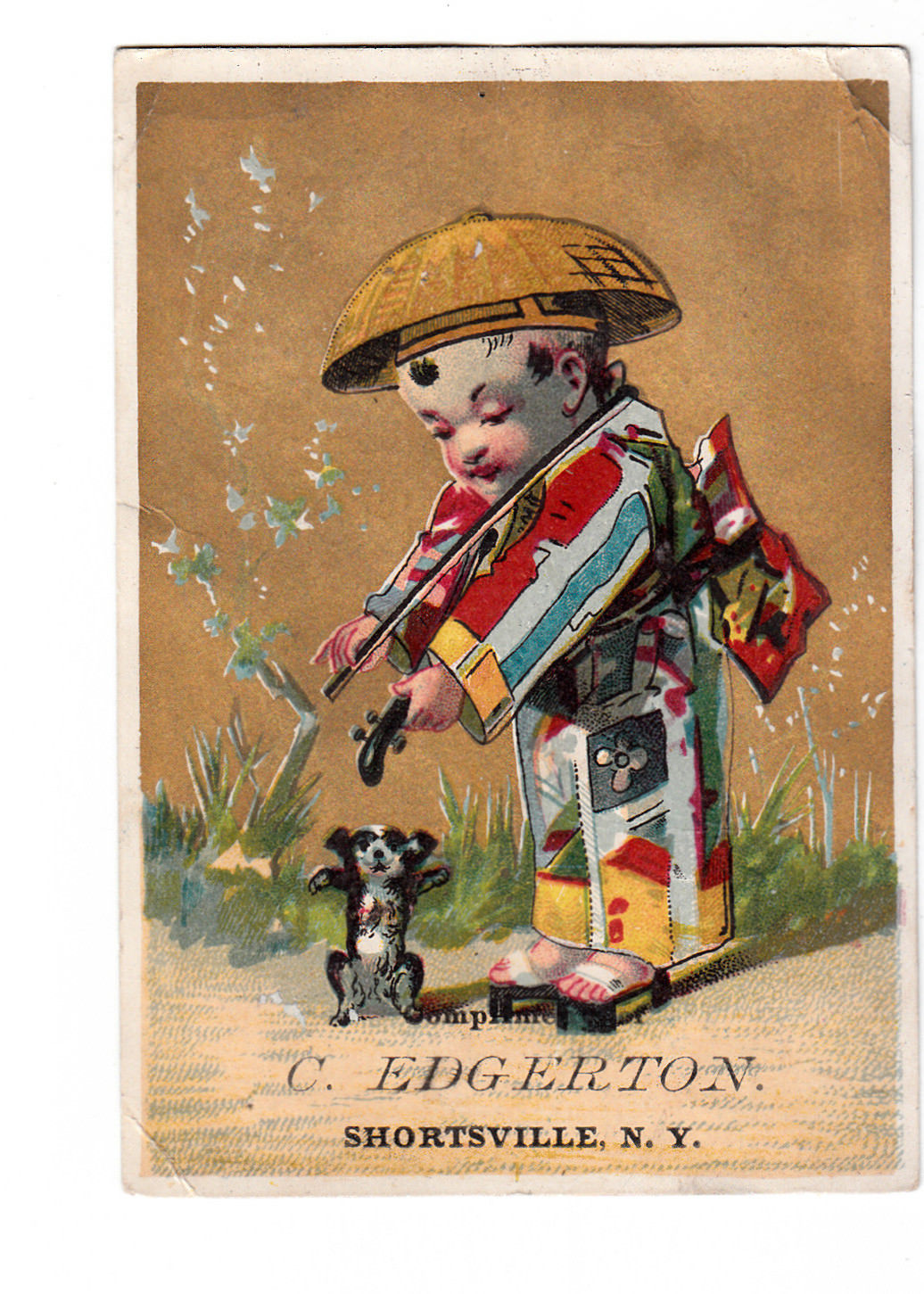 C Edgerton Dry Goods Boots Shortsville NY Chinese Boy Violin Vict Card c1880s