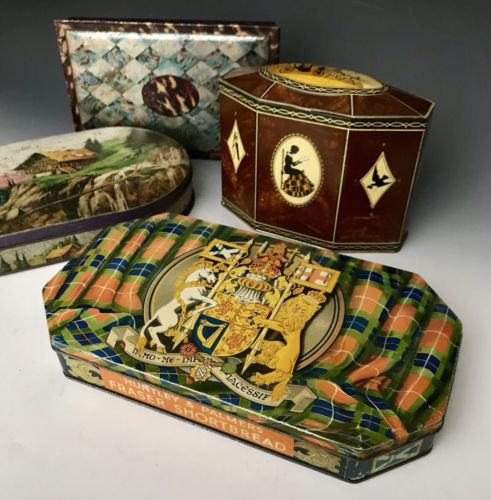Title (ebay affiliate link): (4) Vintage English Biscuit Tins: Huntley & Palmer, Crawford, W&R Jacob, ca.1940