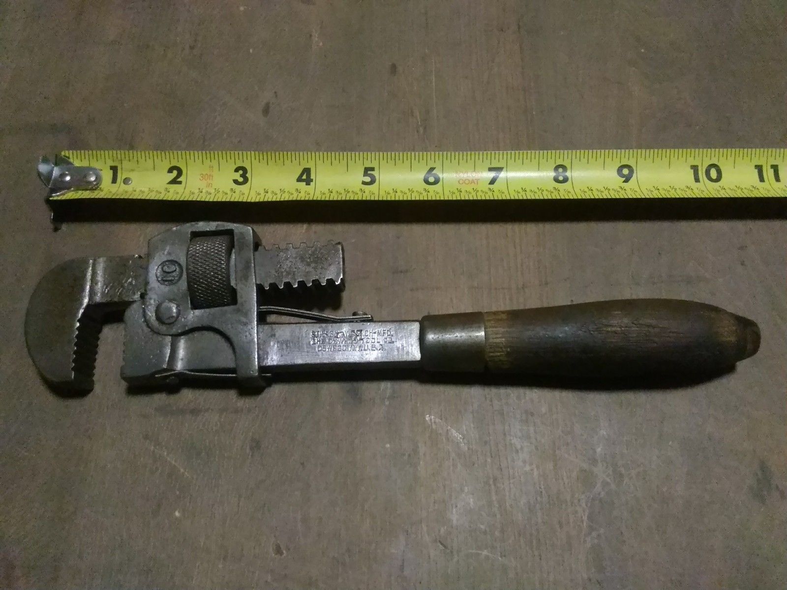 Title (ebay affiliate link): VINTAGE No. 10 STILLSON PIPE WRENCH WOOD HANDLE OSWEGO NEW YORK