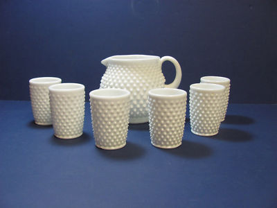 FENTON HOBNAIL MILK GLASS PITCHER W/ 6 CUPS OLD WOW!