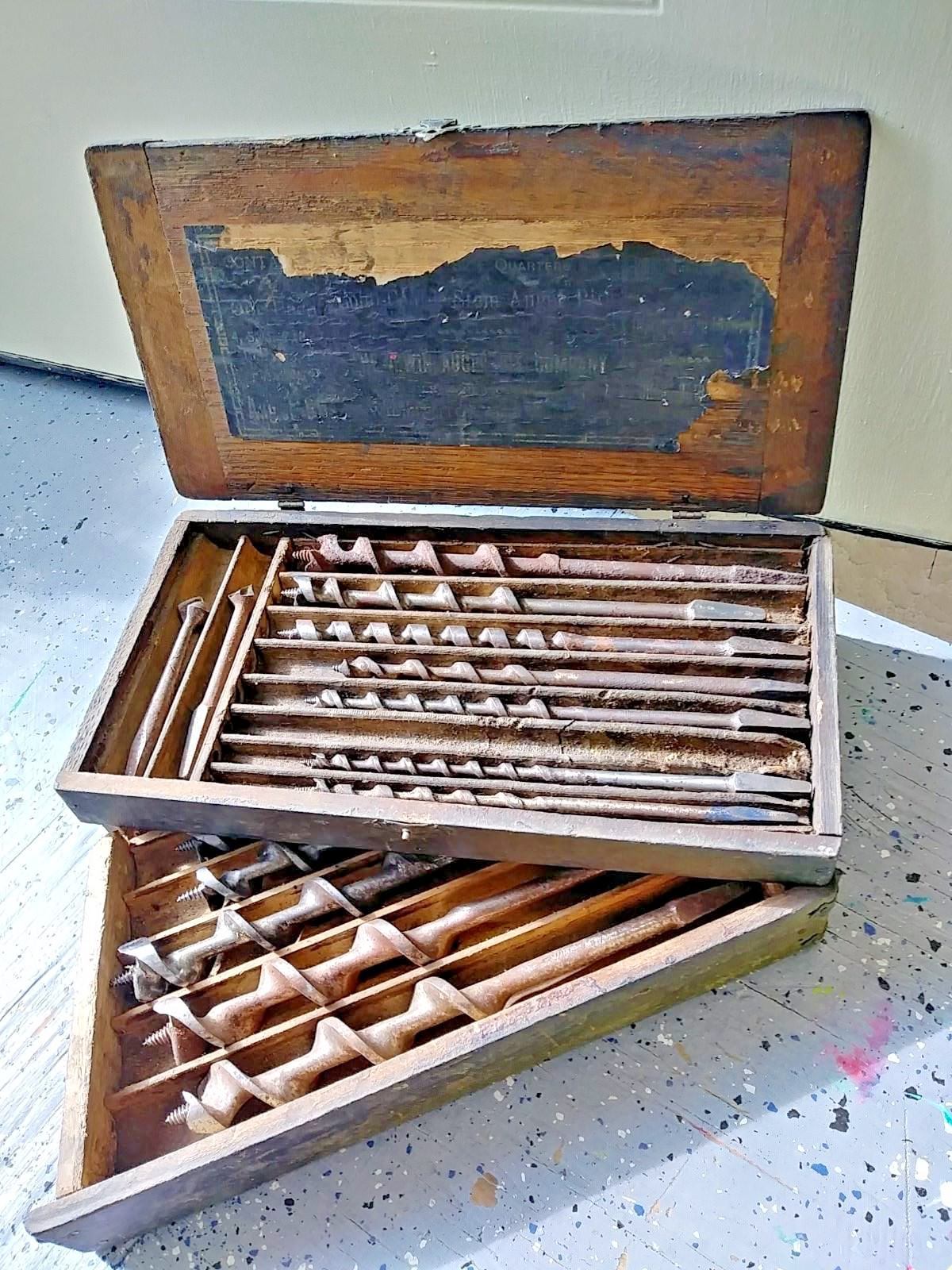 Title (ebay affiliate link): VINTAGE WOODEN DOVETAIL BOXED SET OF 14 IRWIN AUGER Drill Bits 2 DRAWERS