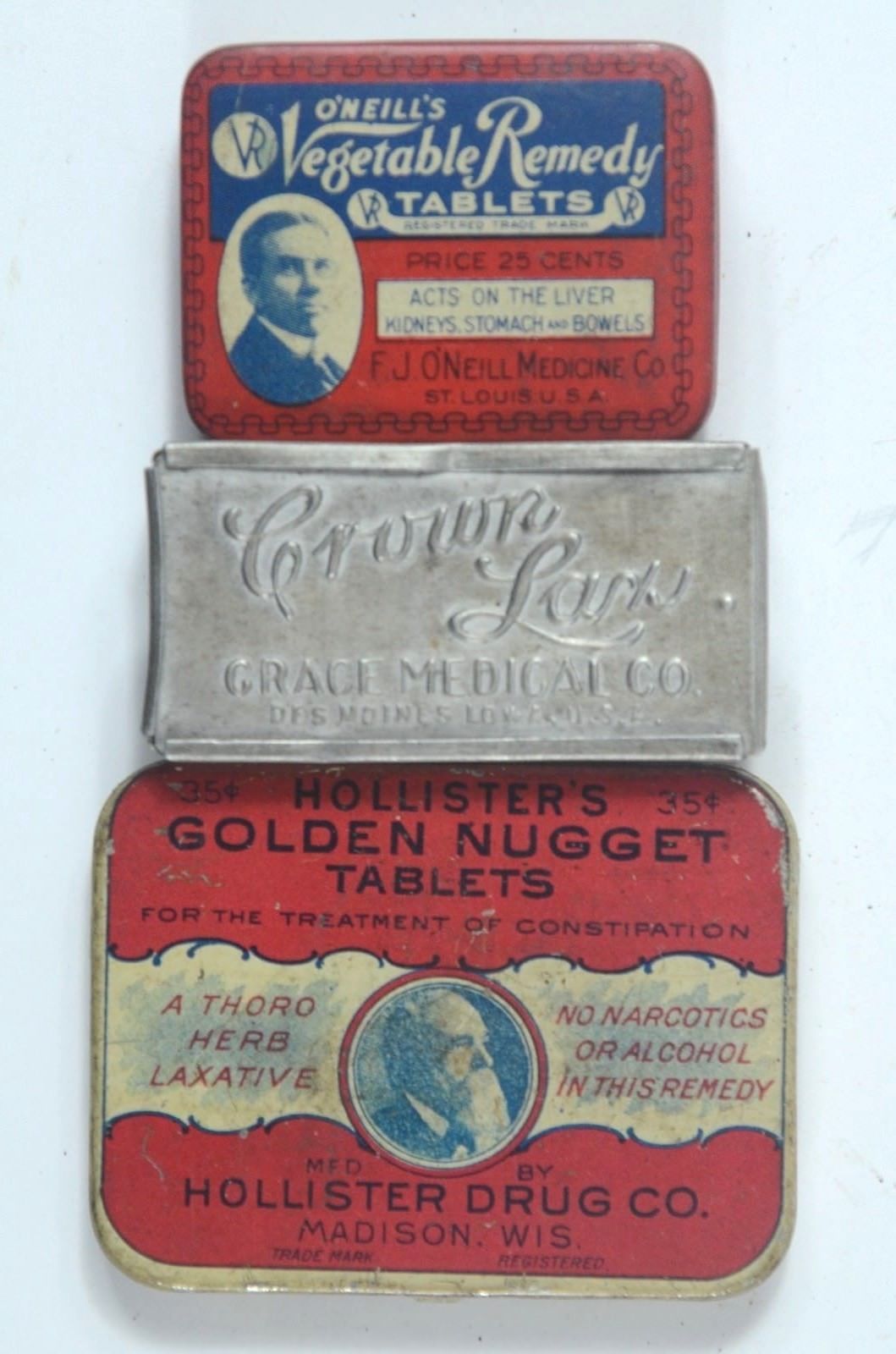 3 VINTAGE DRUG STORE TINS WITH CONTENTS