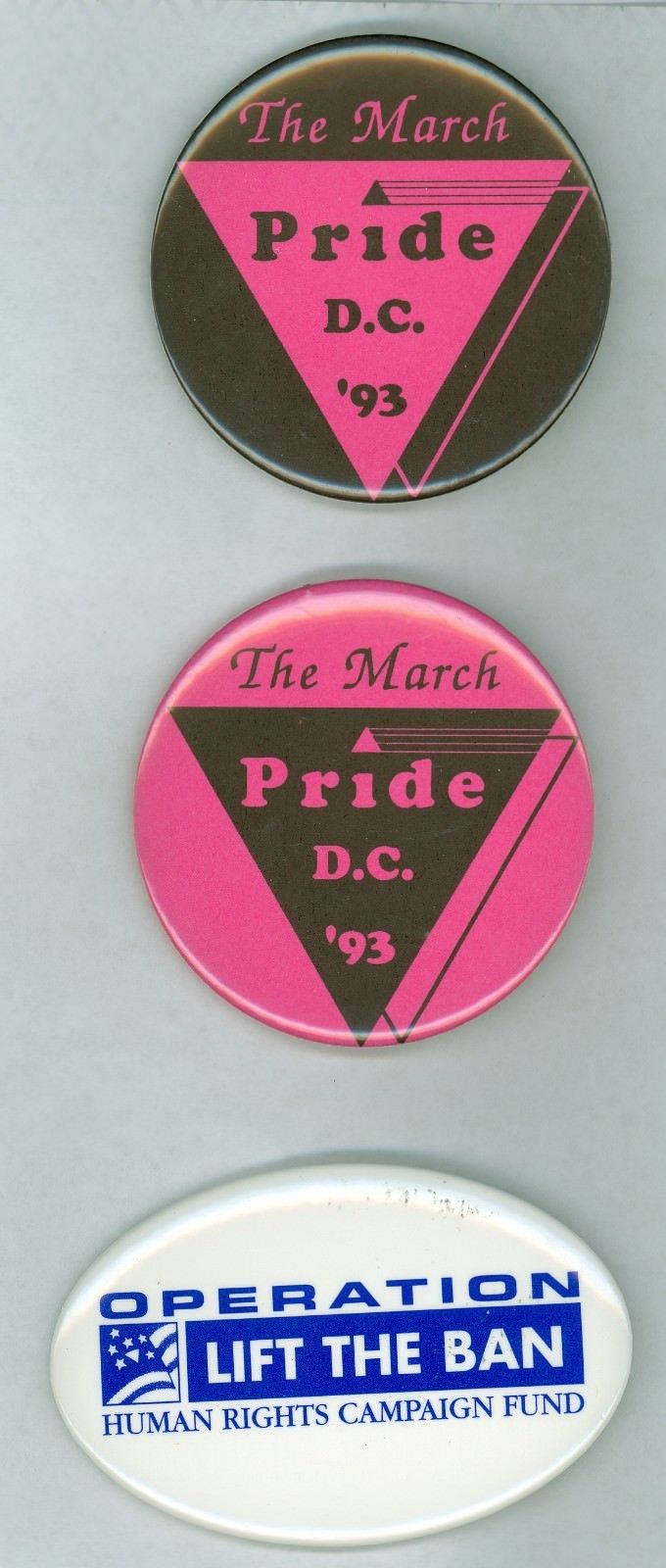 Title (ebay affiliate link): 3 Vintage 1993 Gay Rights Pride Cause Pinback Buttons - Operation Lift The Ban