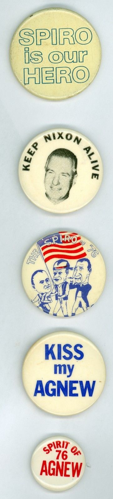 Title (ebay affiliate link): 5 Vintage 1976 Spiro Agnew Political Cause Pinback Buttons Keep Nixon Alive