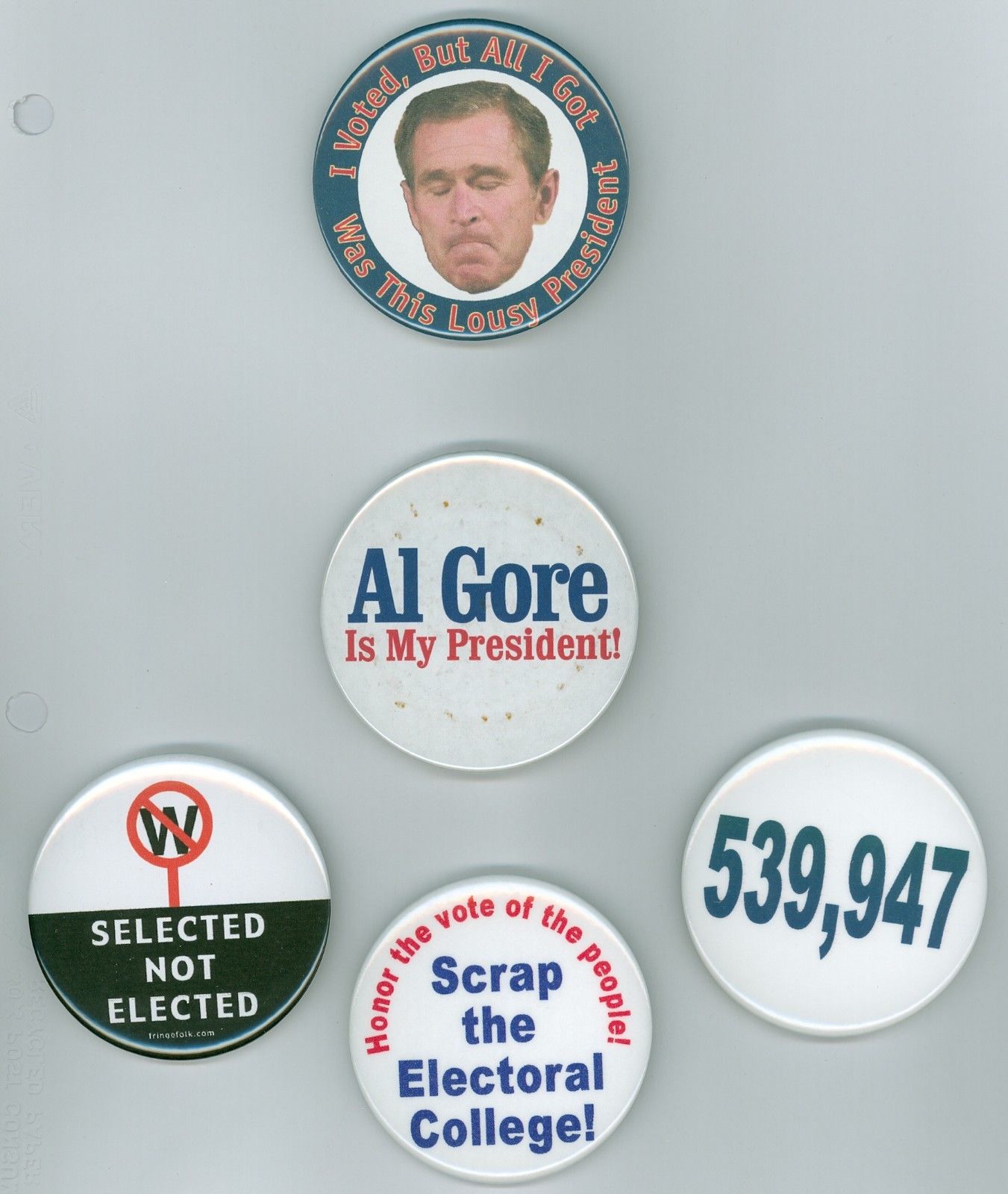 Title (ebay affiliate link): 5 Vintage 00-04 Anti- W Bush Political Cause Pinback Buttons Al Gore Florida