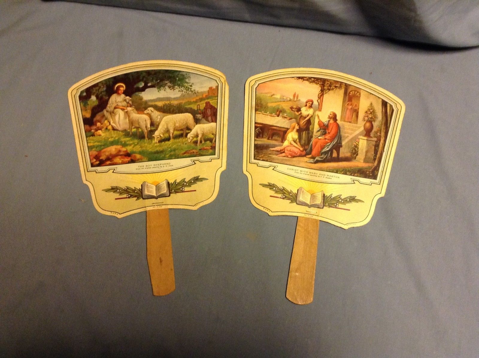 Title (ebay affiliate link): 2 Mid Century Hand Held Religious Jesus Advertising Paper Fans Farmers Union Oil