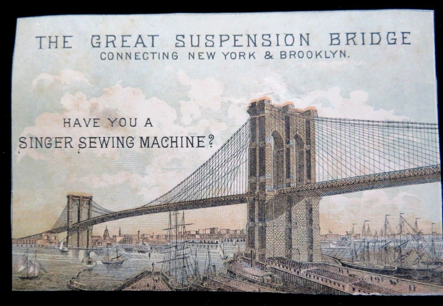 Title (ebay affiliate link): Victorian Trade Card Advertising Singer Sewing Machine With Brooklyn Bridge