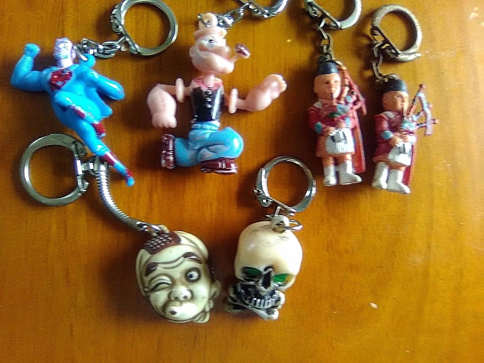 Title (ebay affiliate link): Lot of 6 Vintage Key Chains (Skull+Cross bones, Pop Eye, Super Man + More