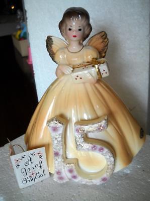 Vintage JOSEF ORIGINALS Figurine Birthday Girl 15 Black Eyes Peach Dress w/Tag