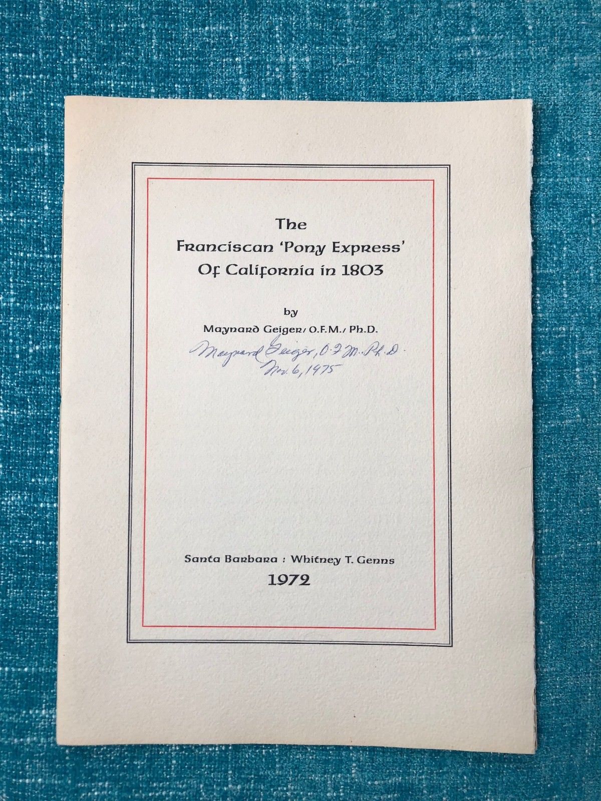 Title (ebay affiliate link): The Franciscan ''Pony Express'' Of California in 1803. Maynard Geiger, 1972
