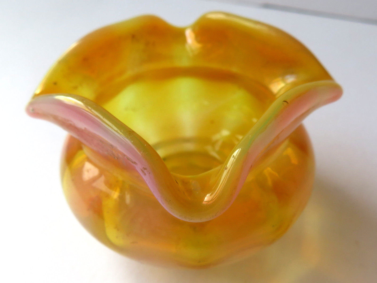 ANTIQUE FIREY OPAL STRIPES ART GLASS BLOWN SALT DIP.