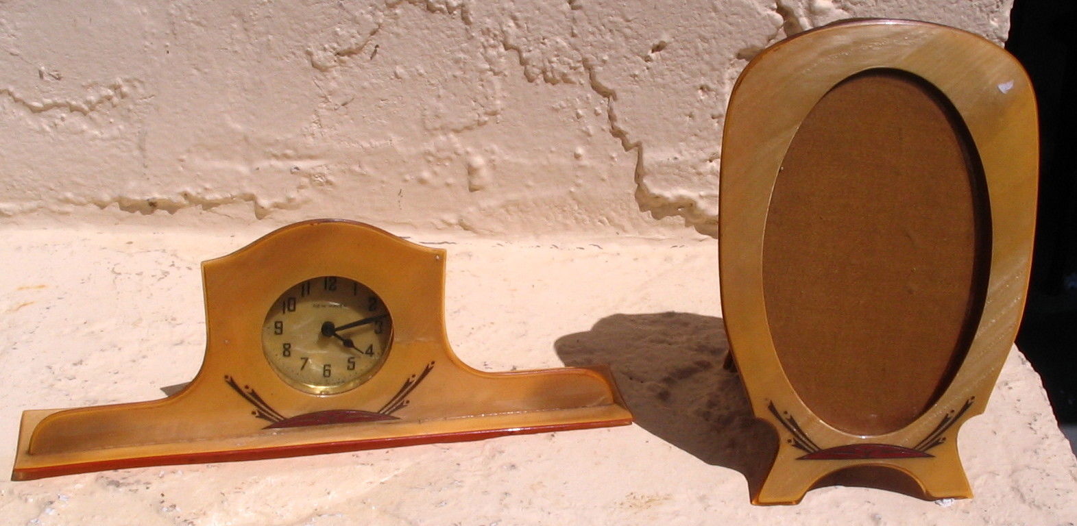 Antique Celluloid Art Nouveau Desk Clock & Oval Picture Frame Set