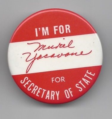 Title (ebay affiliate link): Muriel Yacavone (D) Secretary State candidate 1982 Conn woman political button