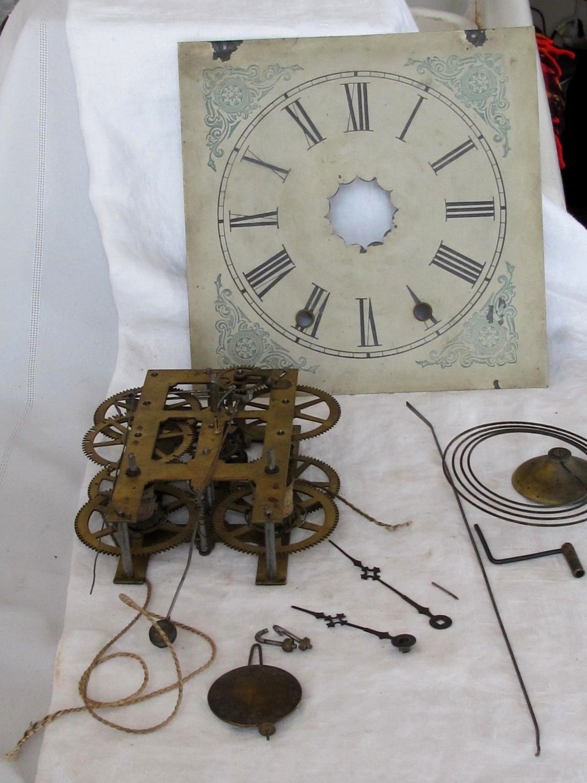 ANTIQUE WATERBURY OGEE CLOCK WORKS , PENDULUM, GONG, METAL FACE, CRANK KEY,HANDS