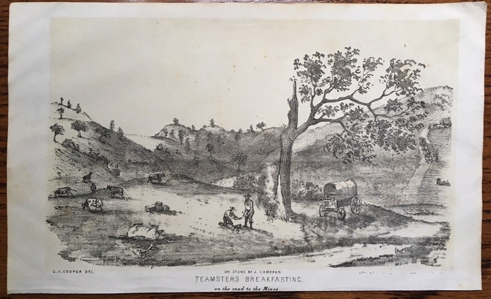 Title (ebay affiliate link): Original 1852 Engraving California Gold Rush Teamsters on the Way to Gold Mines