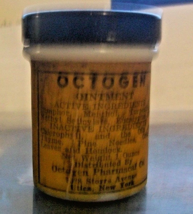 Title (ebay affiliate link): Antique Jar of Octogen Ointment Utica New York Pharmacal Co.