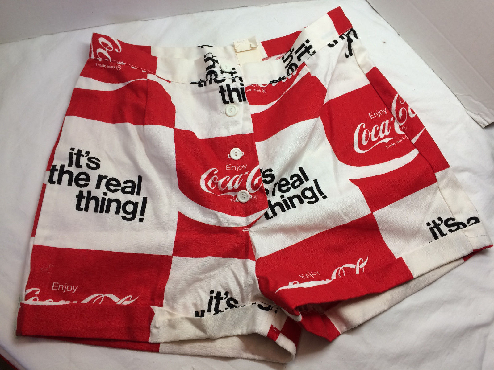 Title (ebay affiliate link): Vintage Coke 1970s Coca-Cola Short Beach Shorts -NEW-Never Worn-RARE Button Fly
