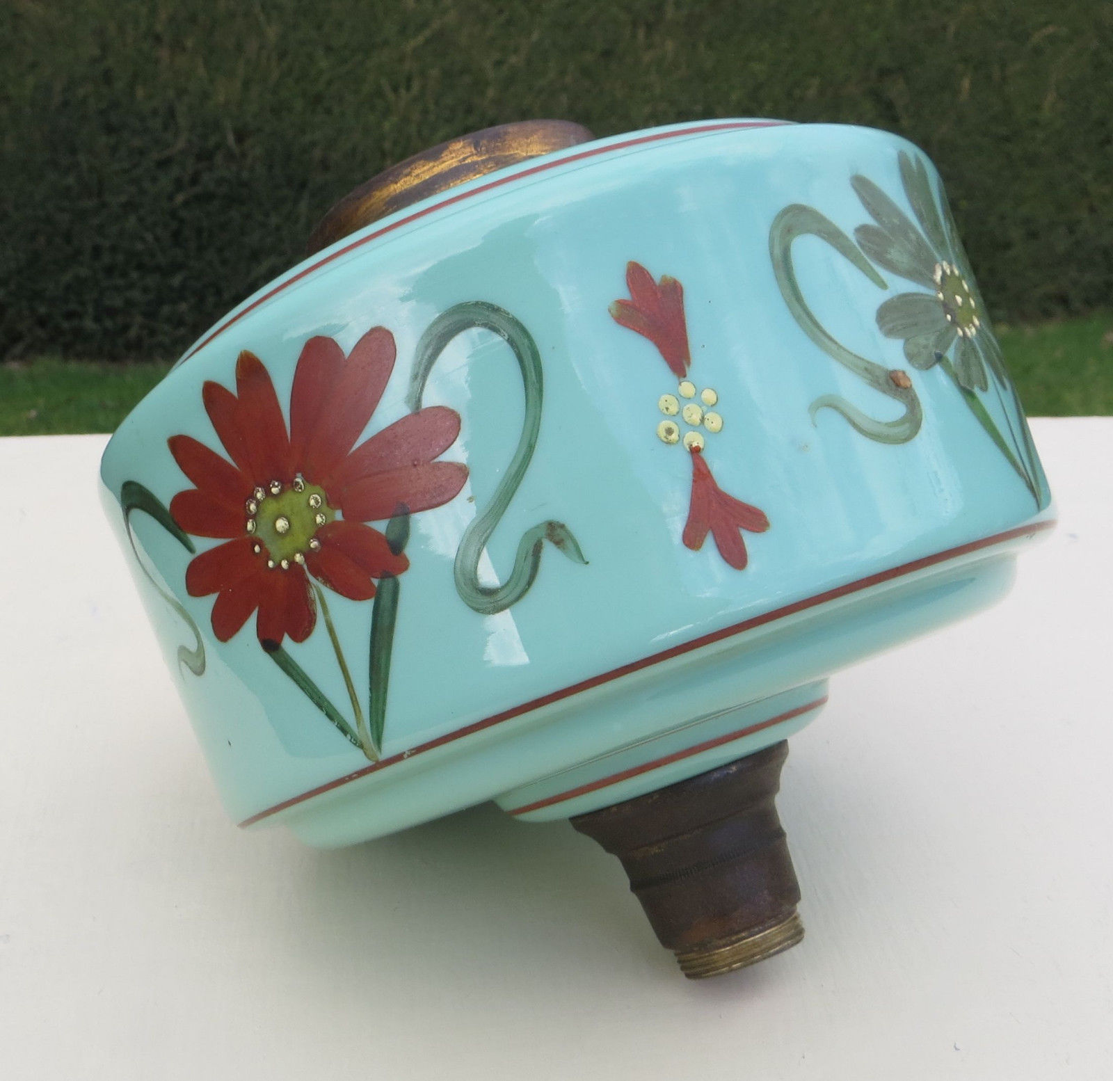 Antique Green Opaline Glass Oil Lamp Duplex Font / Fount - Painted Flowers