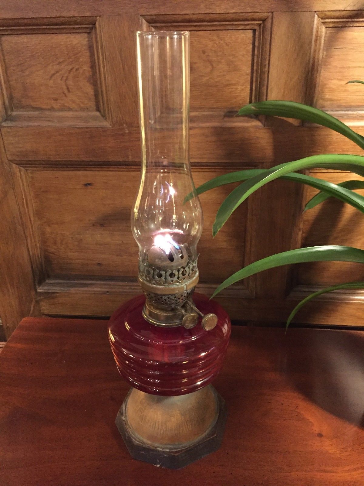 Title (ebay affiliate link): Antique Victorian Brass and Cranberry glass oil lamp in good working order.