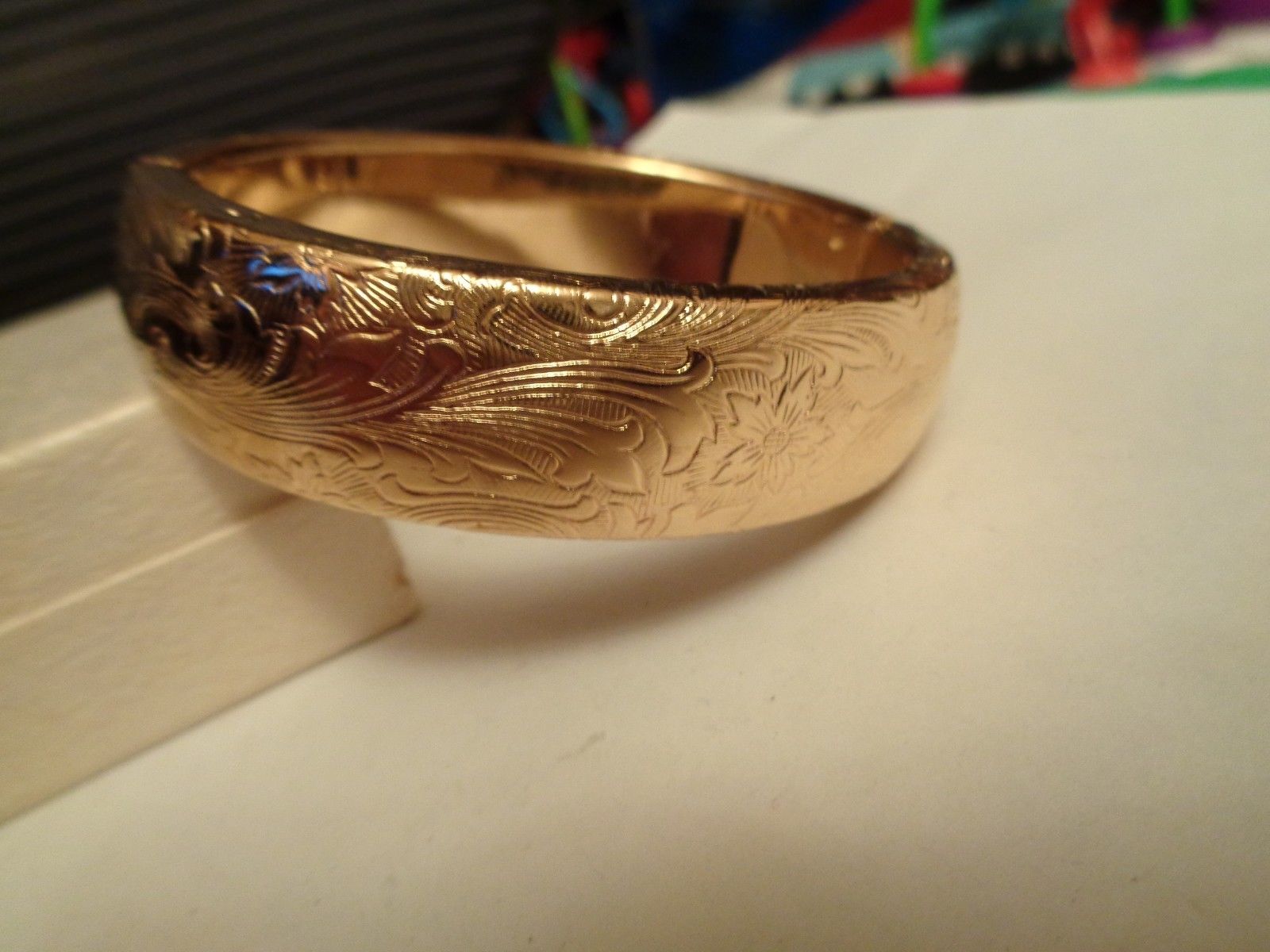 Title (ebay affiliate link): Vintage Antique Hallmark Triangle Floral Etched Hinged Gold Plated Bracelet
