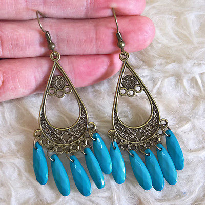 Title (ebay affiliate link): Bohemian Womens Antique-Tone Teardrop Plate BLUE Beads Dangle Hook Earrings 1538