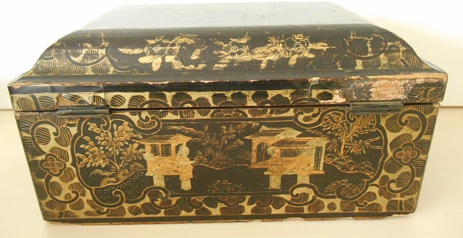 Title (ebay affiliate link): Antique Chinese Hand Painted Gold & Black Lacquer Figures & Pagodas Box Caddy?