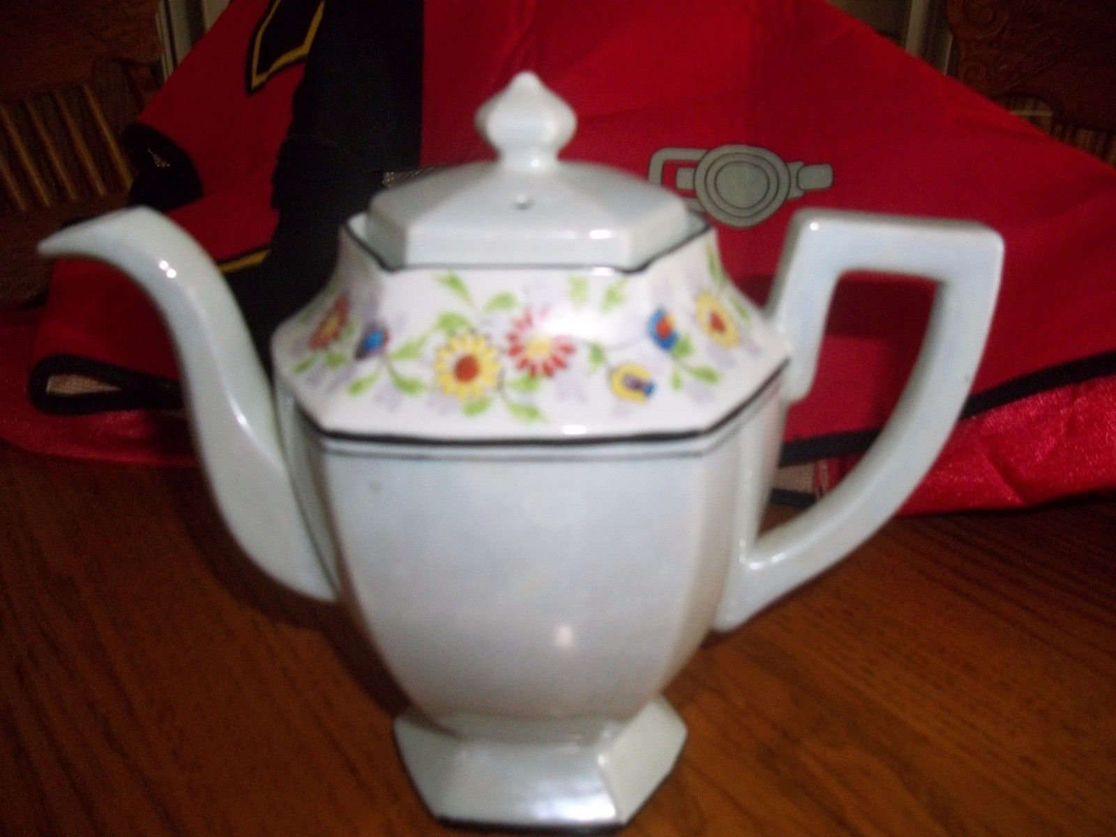 Title (ebay affiliate link): Vintage 6-sided white teapot Black trim Floral Rim Mother of Pearl Rare