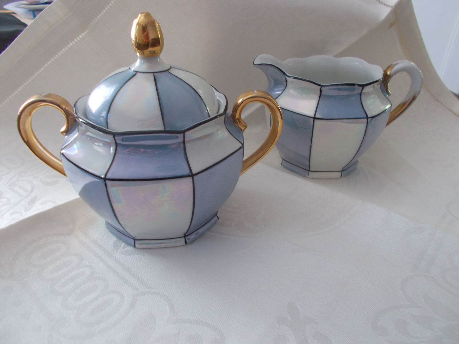vintage Bavarian china sugar + creamer, blue luster, golden highlights, perfect!
