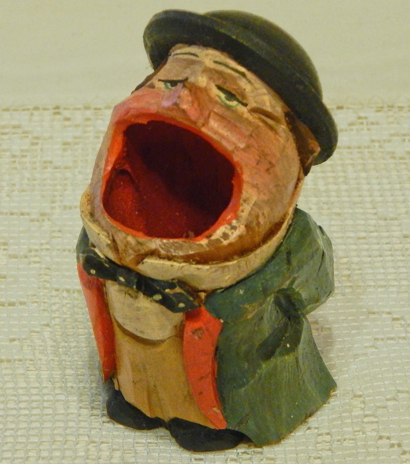 VINTAGE GERMAN HAND CARVED WOOD MAN OPEN MOUTH TOOTHPICK HOLDER, MATCH HOLDER