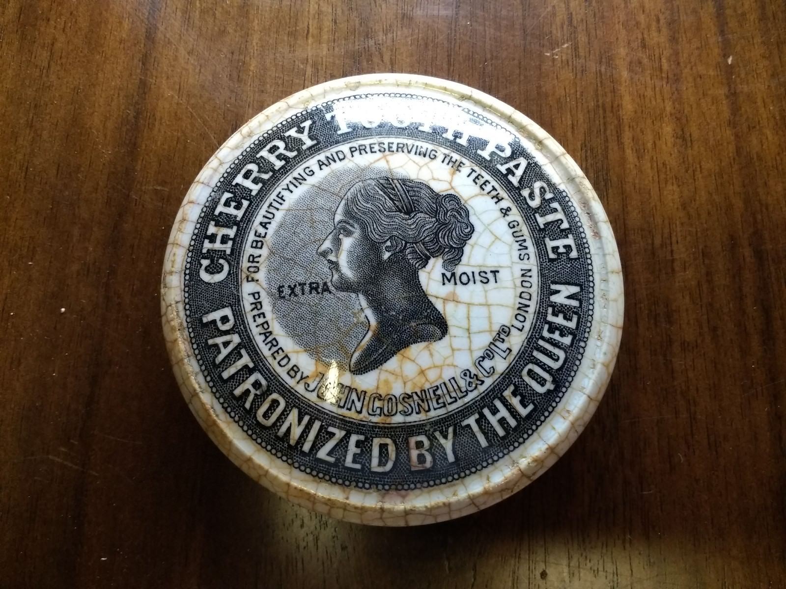 John Gosnell & Co. English Queen''s Cherry Tooth Paste Antique Pot Lid