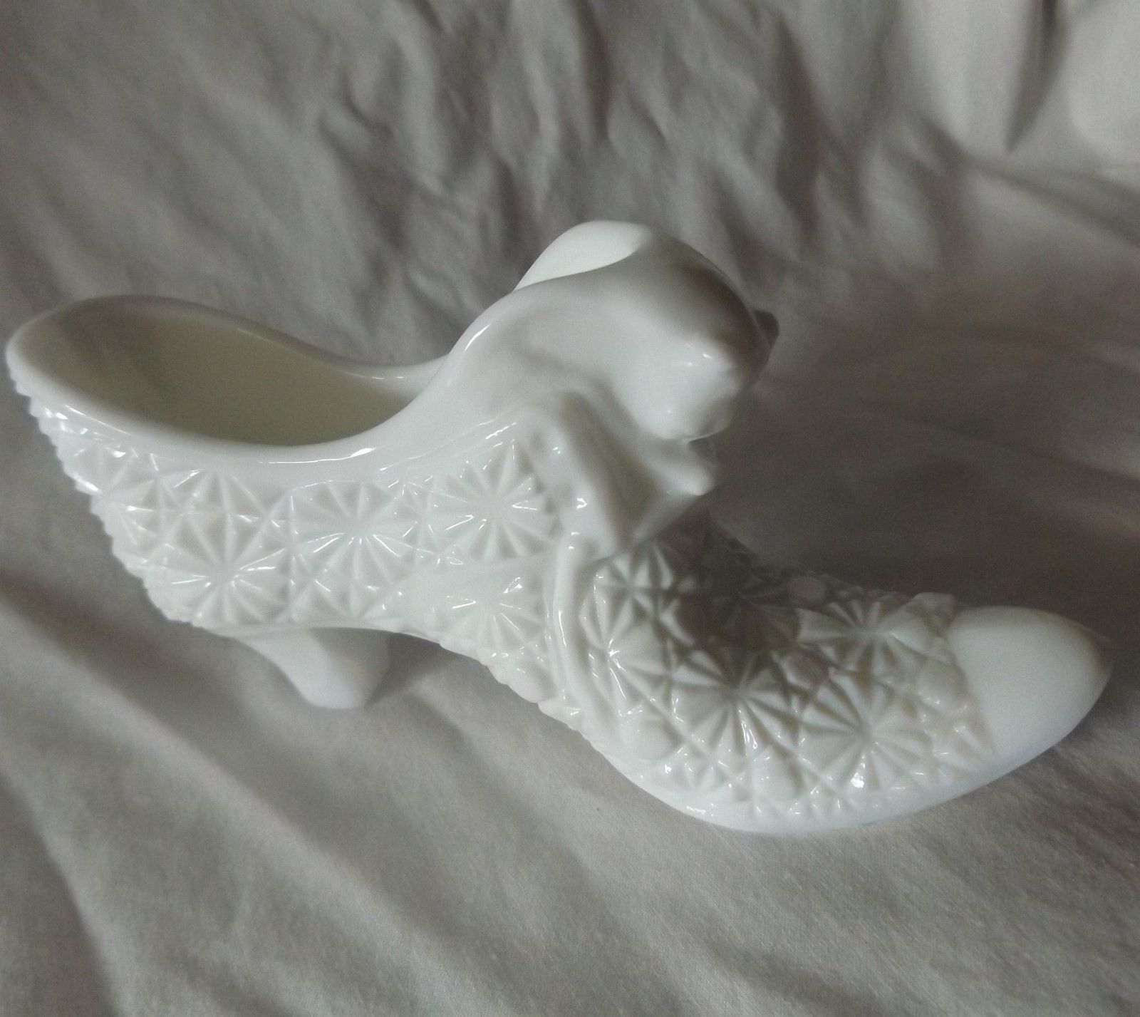 Title (ebay affiliate link): Milk Glass Fenton Daisy and Button Cat Face Shoe Slipper Boot Figurine Vintage